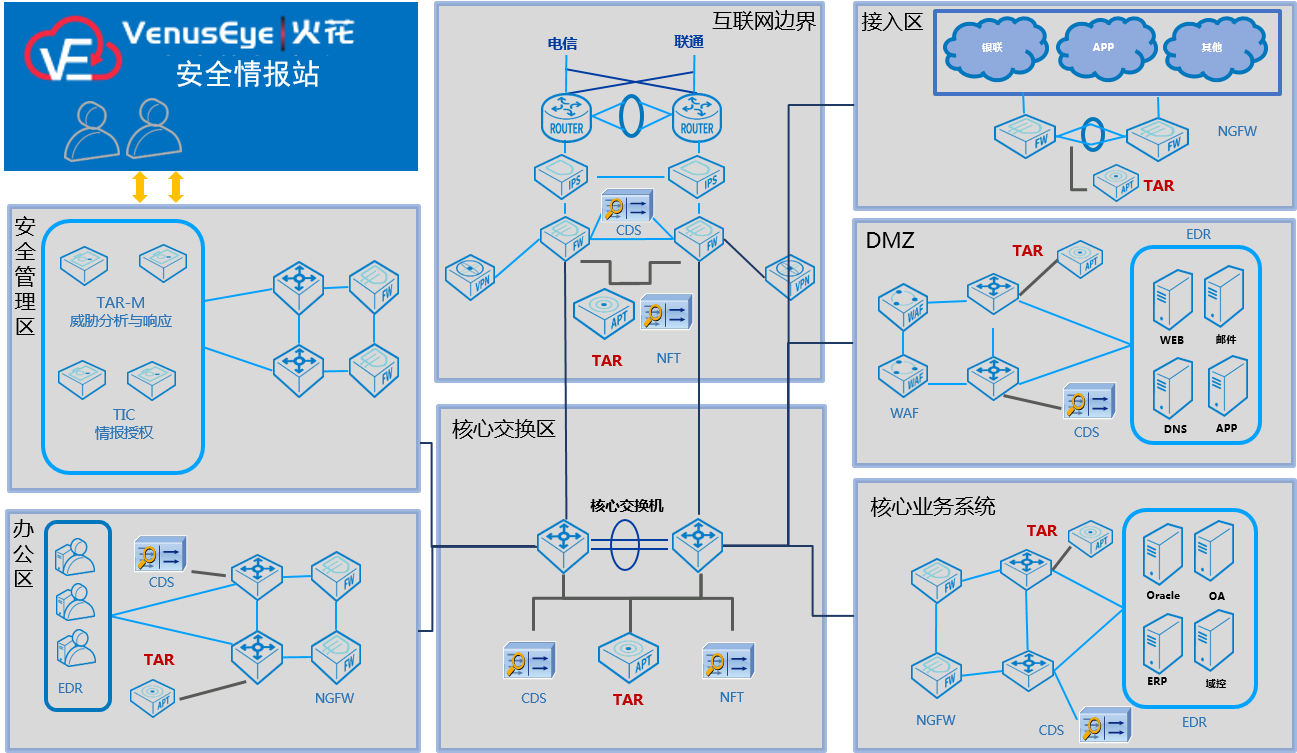 场景描述:重大保障活动场景覆盖;总部到分支机构,安全监测全覆盖;完整攻击取证和攻击链还原能力;可对全流量数据中捆绑的木马、漏洞攻击进行检测,避免恶意文件渗透进入敏感网络,减少APT攻击造成的危害和影响。