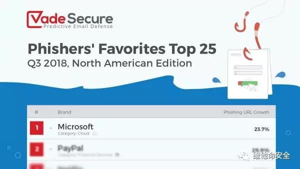 安全厂商Vade Secure发布2018 Q3北美网络钓鱼状况报告,报告指出在第三季度网络钓鱼攻击增长了20.4%,被针对最多的目标是微软,其次是PayPal、Netflix、美国银行和富国银行。针对微软用户的钓鱼攻击主要是为了窃取Office 365凭据,以访问用户的联系人、机密数据和文件等。云服务和金融是两个最被针对的行业。