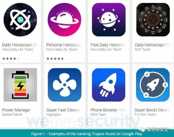 ESET研究人员在Google Play上发现29个应用感染银行木马,这些恶意应用是以不同的开发人员名字上传的,但其恶意代码的相似性和共享的C&C服务器表明它们来自于同一个攻击者或攻击组织。这些应用伪装成booster或者垃圾清理工具、电池管理工具以及占星术APP等,于2018年8月至10月初出现在Google Play上,其总下载次数达3万次。该银行木马可以拦截和重定向短信、拦截通话记录以及下载和安装其它APP等。