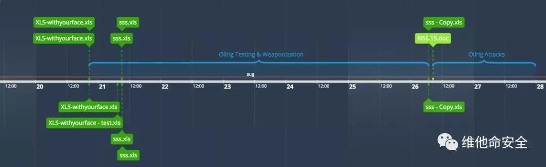 Palo Alto Networks的Unit 42研究团队发布关于犯罪团伙OilRig在发起攻击前对其恶意软件和工具进行测试活动的分析报告。OilRig的测试流程通常包括对其交付文档进行少量修改并提交到在线扫描服务,以确定文件的恶意程度和找出如何规避这些检测。研究人员发现OilRig在攻击前6天就开始了测试活动,并在8月20日、21日和26日分别进行了三次测试。其最终测试文件的创建时间是在交付文档的创建时间(20分钟之后这些文档就通过钓鱼邮件发送出去)的8个小时之前。