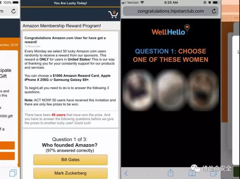 安全厂商Confiant发现一个针对美国iOS用户的大规模恶意广告活动。11月12日该恶意活动疯狂飙升,犯罪分子在48小时内劫持了超过3亿个浏览器会话。该恶意活动通过合法网站上的恶意广告将用户重定向至一系列的临时网站,并向用户推送成人网站或礼品卡主题的诈骗活动。研究人员将该恶意活动关联至犯罪团伙ScamClub。