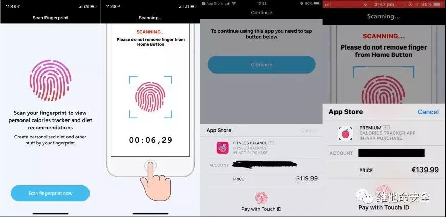 近日App Store中上架了两款恶意iOS健身应用,这两款应用-Fitness Balance和Calories Tracker-表现出了相同的窃取用户金钱的行为。在第一次启动时,恶意应用要求用户触摸TouchID扫描指纹来设置和访问,但实际上恶意应用是在后台进行付款支付,如果用户的App Store帐户绑定了信用卡,则会被窃取99.99美元、119.99美元或139.99欧元。如果用户拒绝扫描指纹,则恶意应用会拒绝启动,并循环显示指纹扫描屏幕,直到用户放弃。该恶意应用并不完善,付款成功的页面会在屏幕上一闪而过。在接到用户投诉后,App Store已下架了相关恶意应用。