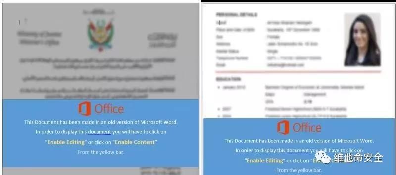 Yoroi发布MuddyWater感染链的分析报告。在2018年11月底,APT组织MuddyWater先后攻击了黎巴嫩、阿曼王国和土耳其的相关机构,这些攻击活动中的攻击向量和最终payload都是相同的。攻击者通过鱼叉式网络钓鱼进行攻击,并在邮件中包含字迹模糊的文档,诱使用户执行VB宏代码,并最终通过恶意软件POWERSTAT感染系统。