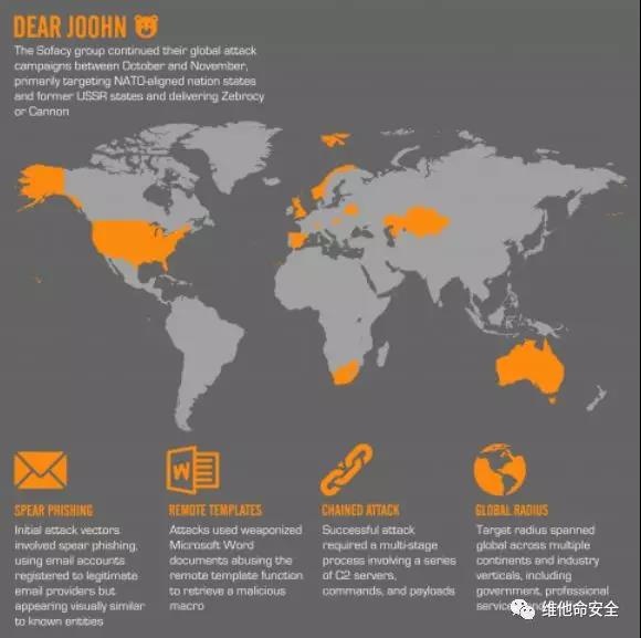 Palo Alto Networks的Unit42团队发布关于APT28近期针对政府机构的恶意活动的分析报告。2018年10月中旬到2018年11月中旬期间,APT28持续袭击了世界各地的多个政府机构,主要目标是北约国家,但也包括几个前苏联国家。这些攻击活动主要部署了Zebrocy或Cannon变种,其交付的恶意文档使用了同一个作者名称:Joohn。研究人员分析了收集到的9个恶意文档,并建立了Dear Joohn活动的时间线。