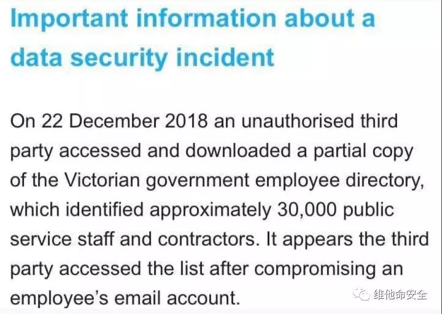 https://www.databreaches.net/thedarkoverlord-releases-files-related-to-9-11-investigations-and-litigation-threatens-to-release-more-if-companies-dont-pay-up/4、澳大利亚维多利亚州3万名政府员工的个人信息泄露