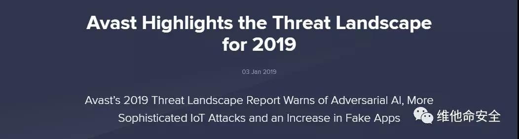 Avast的2019年威胁态势预测报告指出,在2019年对抗性AI将迎来黎明。研究人员预测DeepAttacks攻击将更频繁地出现(这类攻击通常利用AI生成的内容来逃避AI安全控制措施)。此外,物联网威胁将变得更加复杂,路由器也将越来越多地成为攻击目标,广告、钓鱼和虚假应用将继续主导移动威胁领域。