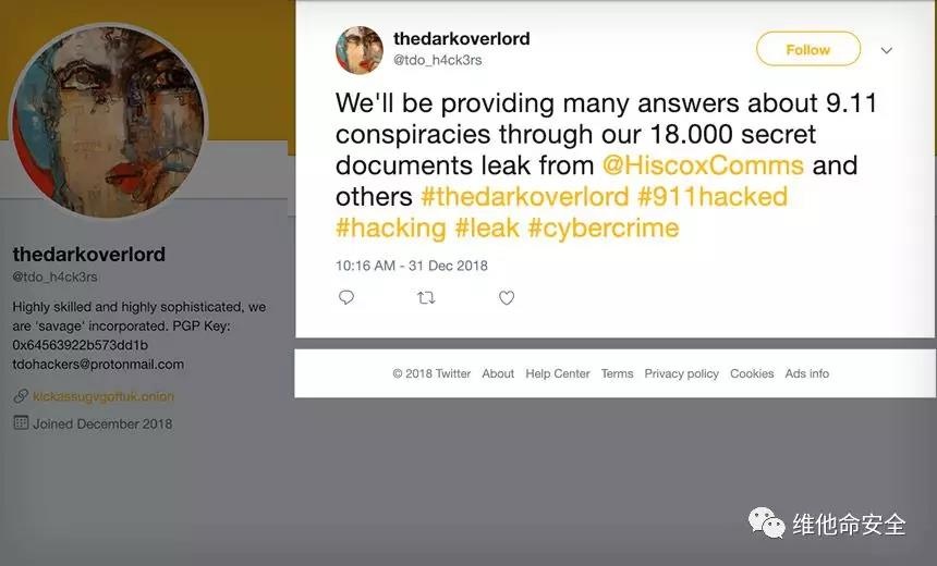 Dark Overlord发布了第一批与911恐袭相关的650份机密文件的解密密钥。之前Dark Overlord声称从英国保险公司Hiscox窃取了大量文件,其中包括与911诉讼案件相关的数万个文件。Dark Overlord威胁将向公众披露这些文件,除非该公司支付一笔比特币赎金。Dark Overlord宣布了一项“分层发布计划”,公众可以向其支付比特币以解锁这些文件,这次披露的即为第一层的文件。