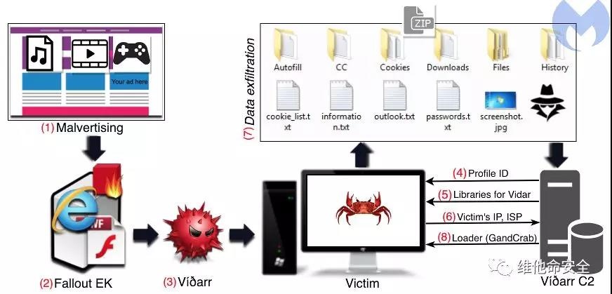 Malwarebytes Labs发现一个同时分发Vidar和GandCrab的新攻击活动。Vidar可以窃取用户的浏览器历史记录(包括Tor浏览器),还可以窃取加密货币钱包信息、信用卡密码以及即时消息等。Vidar通过未加密的HTTP POST请求将这些数据发送回C2服务器。在这个攻击活动中,攻击者通过Fallout EK分发Vidar和另一个有效荷载:勒索软件GandCrab。在用户受到Vidar感染后的大约1分钟内,用户的文件就会被GandCrab v5.04所加密。