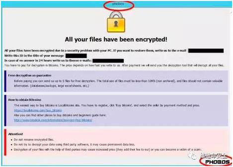 CoveWare研究人员发现针对全球企业的新勒索软件Phobos,Phobos出现于2018年12月份,并且与勒索软件Dharma存在许多相似之处。与Dharma一样,Phobos利用开放的或安全性较差的RDP端口进行入侵。被加密的文件会被添加.phobos扩展名。Phobos要求以比特币的方式支付赎金,其勒索单据上的字体和文本与Dharma完全相同。研究人员还称Phobos的大部分代码也与Dharma一致。