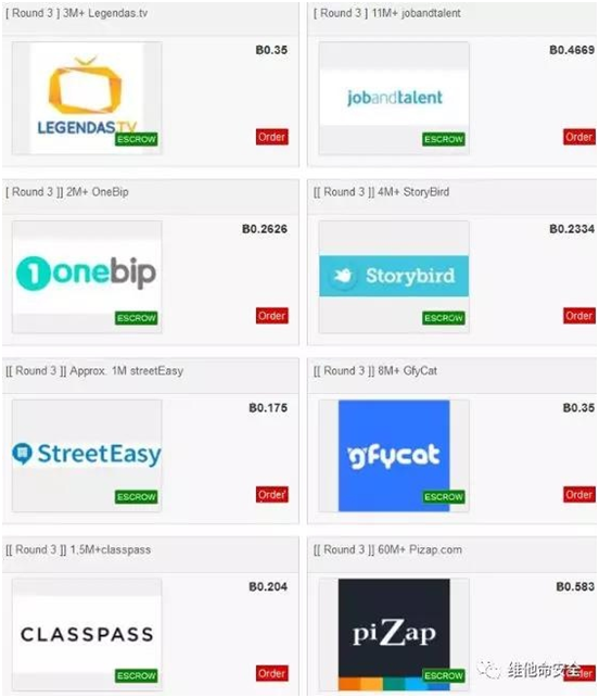Gnosticplayers在暗网市场上发布了第三批待售的用户账户数据,涉及到8个网站的9276万用户。这8个网站包括:Legendas.tv(386万)、Jobandtalent(1100万)、Onebip(260万)、StoryBird(400万)、StreetEasy(100万)、GfyCat(800万)、ClassPass(150万)和Pizap(6080万)。这批用户数据的总价格为2.6249个比特币,共约9400美元。