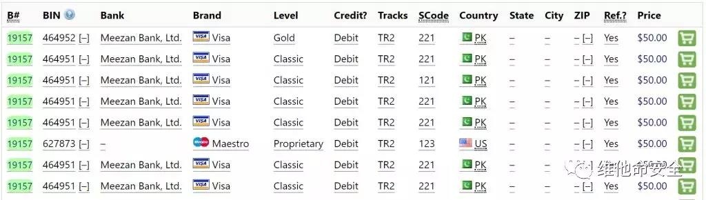 Group-IB研究人员发现69189张巴基斯坦银行卡的信息在暗网上出售。这批数据分为两个数据库,总售价约为350万美元。第一个数据库是1月底在Joker's Stash上发布的,共包括1535张银行卡信息,其中96%的银行卡都与Meezan Bank有关。第二个数据库是1月30日在Joker's Stash上发布的,包括67654张银行卡信息,同样有96%的银行卡与Meezan Bank有关。这些数据可能表明了该地区针对金融机构的攻击者的活动。
