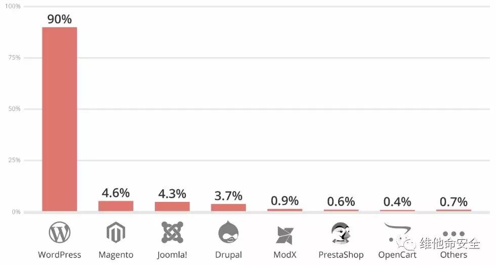 根据Sucuri的一份调查报告,在2018年被黑客入侵的网站的CMS分布中,WordPress遥遥领先,占90%,二三四名分别是Magento(4.6%)、Joomla(4.3%)和Drupal(3.7%)。68%的受感染网站被植入了后门,56%的受感染网站托管了其它恶意软件。此外,51%的受感染网站被部署了SEO垃圾信息页面,2017年这一数字是44%。