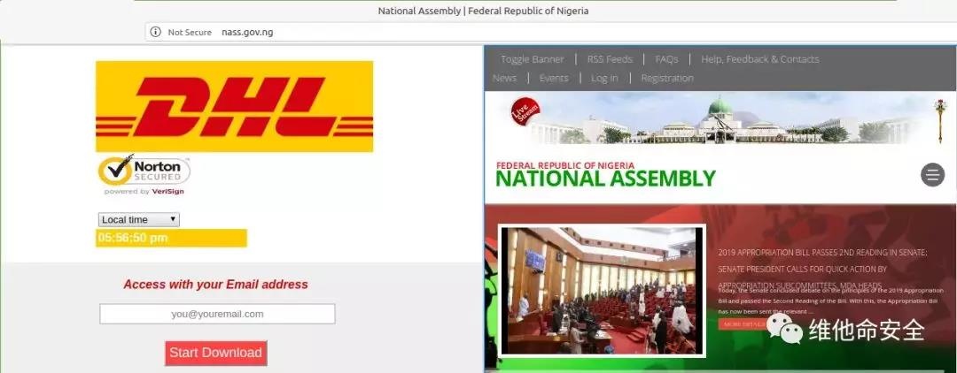 MalwareHunterTeam研究团队发现尼日利亚国民议会(NASS)官网上托管了一个伪装成国际快递服务DHL的钓鱼页面,该页面至少存在了两周的时间,主要窃取用户的DHL账户凭据。这个钓鱼页面u.php存在于多个被渗透的合法网站上,包括onlinequranglobal[.]com、pioneer-sys[.]net等。研究团队还称NASS的官网之前就曾托管过多个恶意站点。