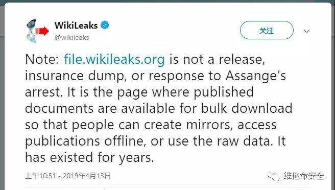 4月13日维基解密在Twitter上发布了数千份敏感文件的合集下载链接,根据维基解密的官方说明,该链接是已发布文件的合集,便于用户创建镜像、脱机访问或使用原始数据,并不是对阿桑奇被捕的回应。该链接的网址为https://file.wikileaks.org/,仅file文件夹就包含1763份文件,文件的时间都显示为1984年1月1日。