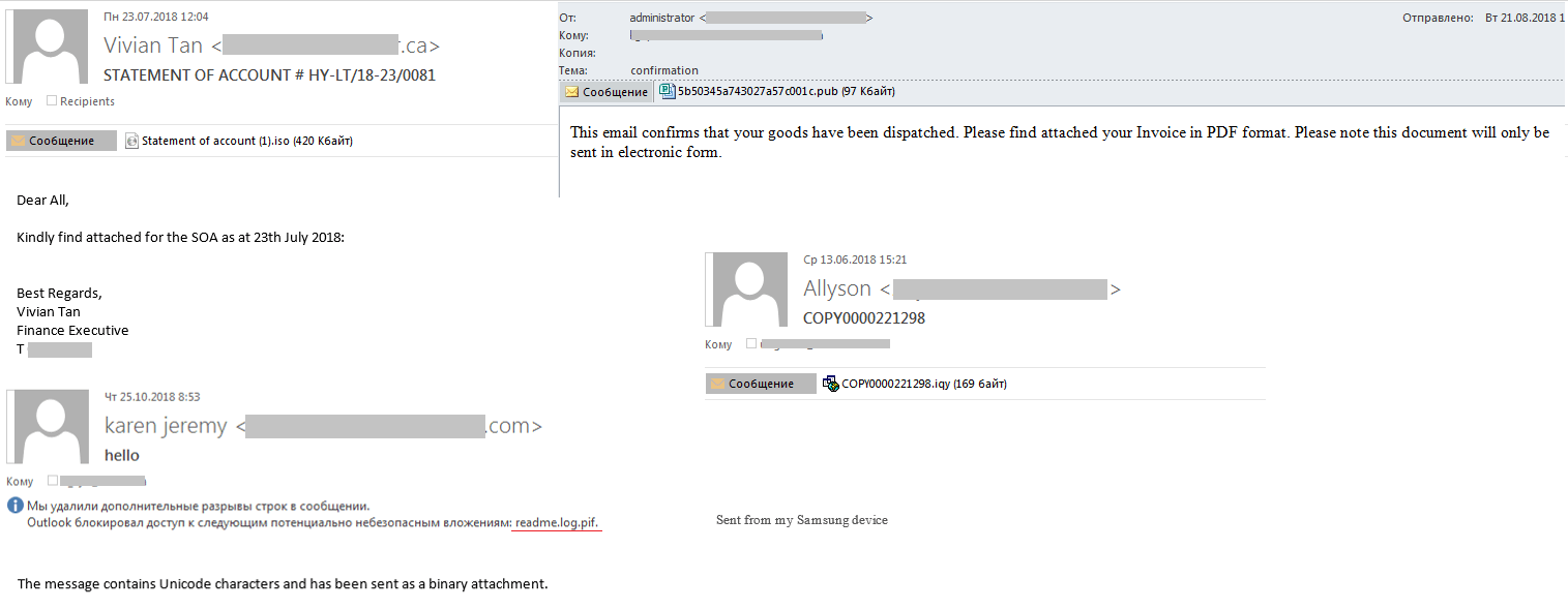 2018年继续见证了垃圾邮件注重细节的趋势。为了模仿商业邮件,犯罪分子在细节上注重利用公司的真实信息,例如logo和签名。为了绕过安全措施(以及欺骗用户),犯罪分子使用了各种非典型的垃圾邮件附件格式,包括ISO、IQY、PIF和PUB附件。