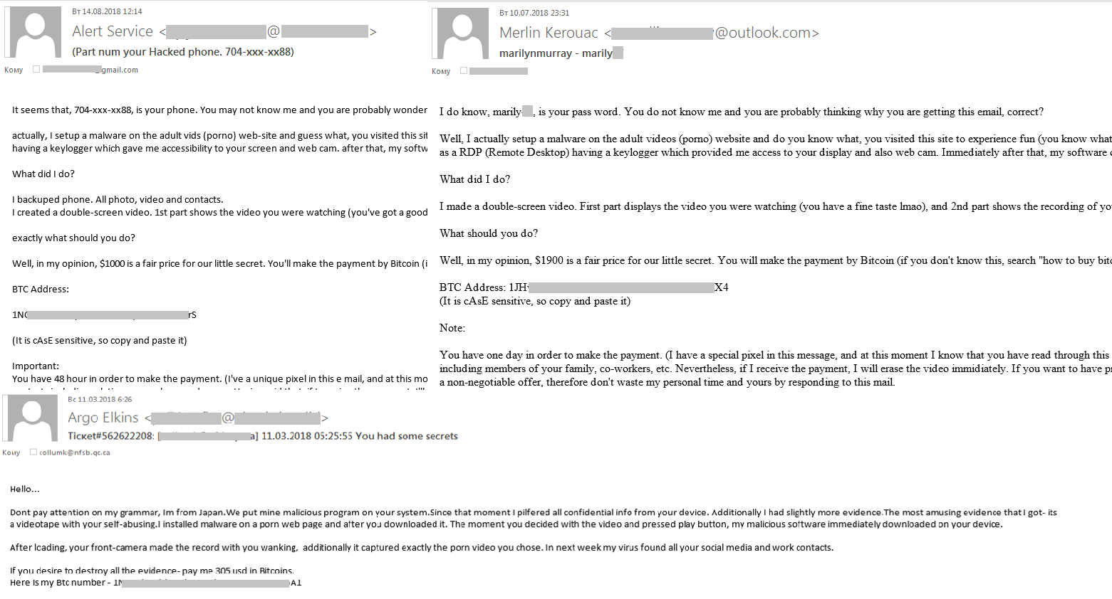其中一种最为流行的欺诈手段是“sextortion”(性欺诈)。在这种骗局中,犯罪分子声称拥有受害者的私密信息,要想不被泄露,就必须要向指定的加密货币地址汇款。通常情况下,犯罪分子会利用受害者的真实身份信息进行恐吓,例如姓名、密码、电话号码等,使得这种骗局格外可信。这些身份信息来自于越来越多的数据泄露事件,由于数据真实可信,受害者往往陷入恐慌之中,不得不满足犯罪分子的要求。2018年,这种骗局勒索的赎金从几百到数千美元不等。