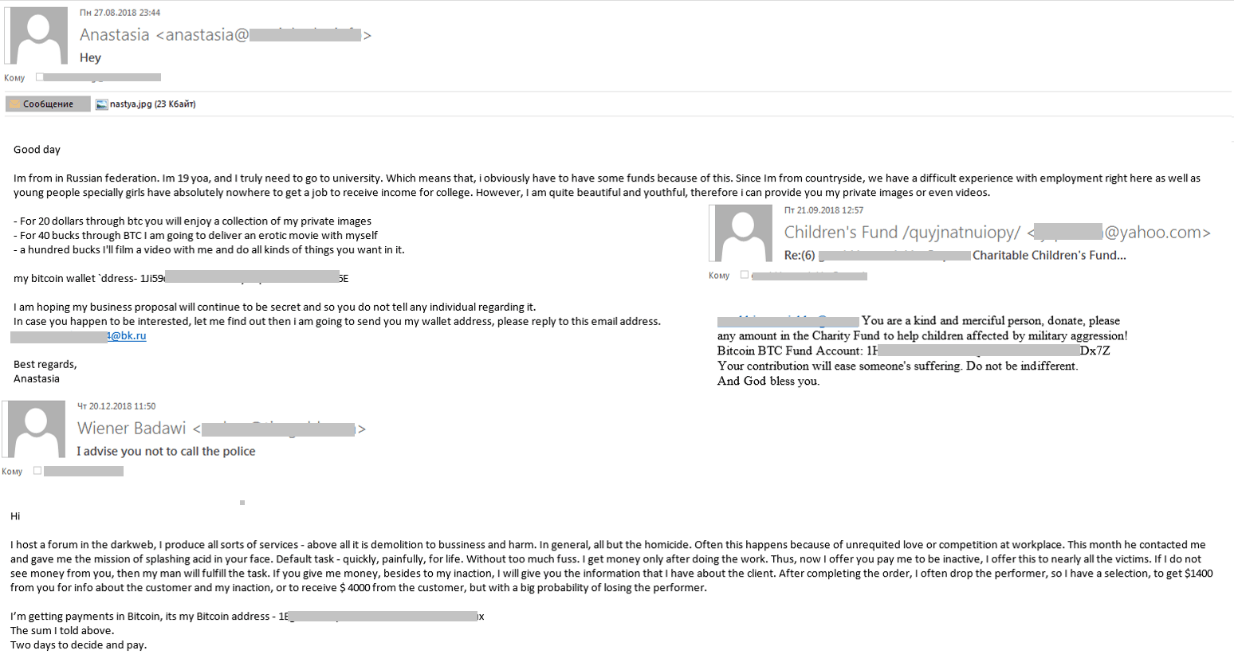 犯罪分子也没有忘记其它诈骗手段。在2018年,我们观察到伪装成大型慈善机构的欺诈邮件,这些邮件要求购买一些数据来为儿童捐款。所有这些欺诈方式都有一个共同点:付款必须通过加密货币。应该注意的是,与sextortion相比,这些诈骗信息要少很多。