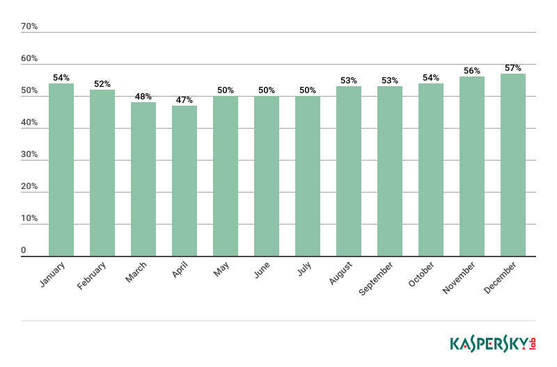 份额最低的月份为2018年4月(47.70%),最高的月份为12月(57.26%)。