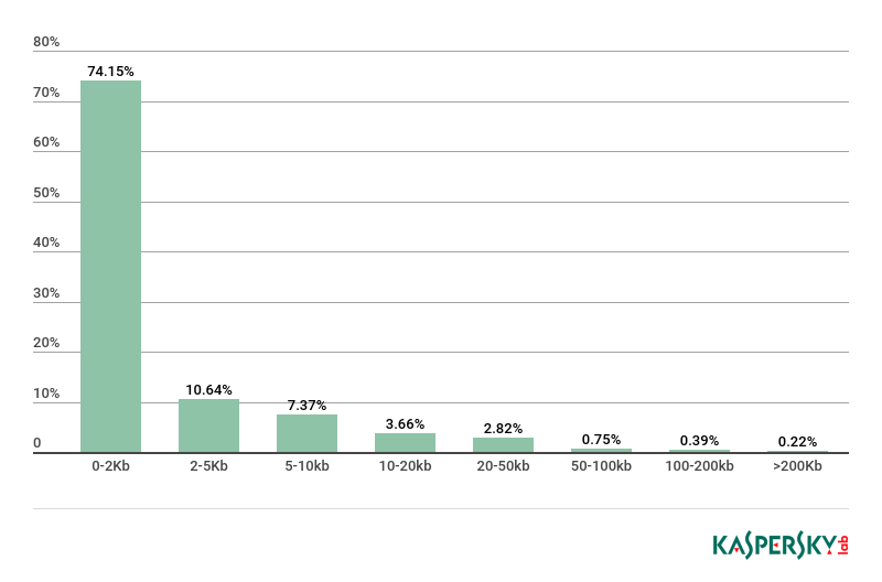 2018年,超小型垃圾邮件(小于2KB)迅猛增长。尽管季度性的下降,但年度数据达74.15%,比上一报告期增长了30.75个百分点。2-5KB的垃圾邮件同样有所增长(增长了5.56个百分点,达10.64%)。