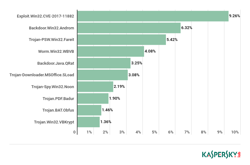 2018年垃圾邮件中传播最广泛的恶意对象是Exploit.Win32.CVE-2017-11882,它利用了Microsoft Office中的任意代码执行漏洞。