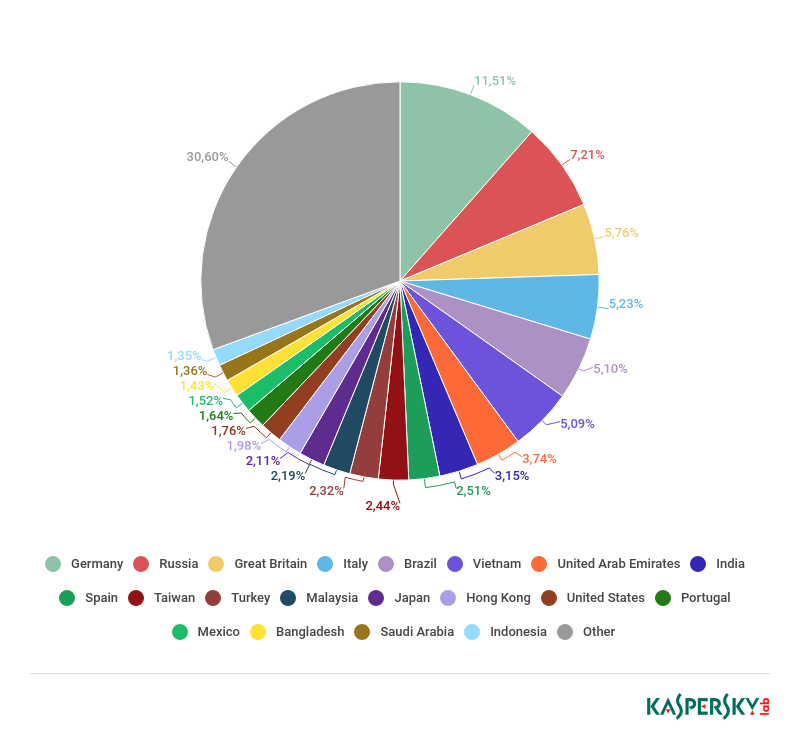 和往年一样,2018年的第一名是德国,其份额占所有攻击的11.51%。第二名是俄罗斯(7.21%),第三名是英国(5.76%)。