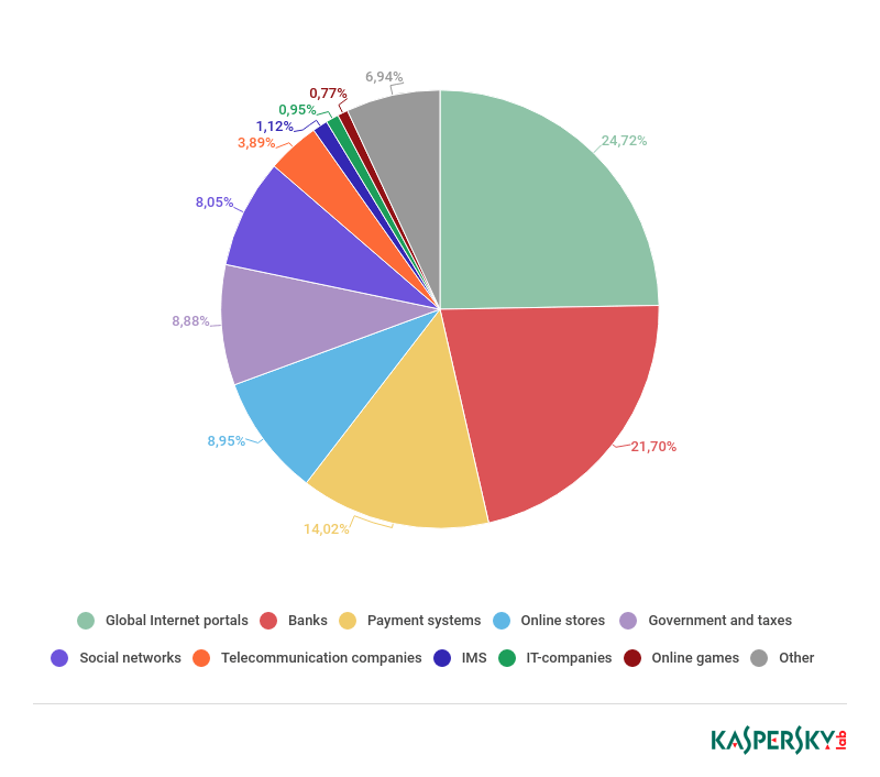 对目标企业的分析是基于卡巴斯基反钓鱼系统的启发式组件触发结果进行的。根据卡巴斯基的钓鱼网址数据库,该组件可在用户访问邮件或网页中的钓鱼链接时触发。