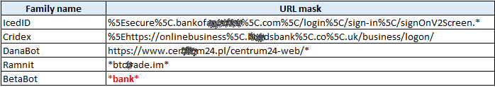 报告中的攻击目标是从僵尸网络配置文件或C&C命令中提取的URL规则(例如,用于匹配指定在线银行服务URL的规则)。