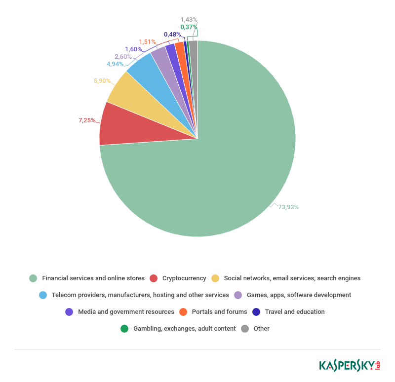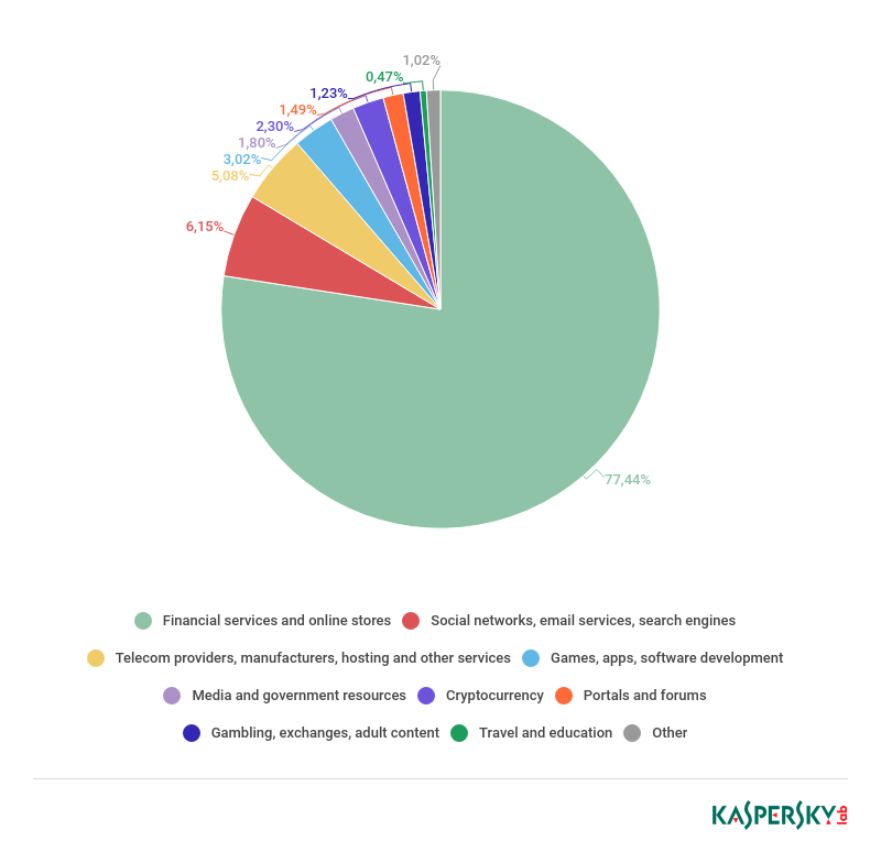 2017年,受攻击目标中占比最大的是金融服务类别(77.44%),这包括在线银行服务、聚合银行服务、在线商店以及其它与金融交易(不包括加密货币)相关的资源。这一结果在意料之中,因为犯罪分子可直接获得受害者财务资金的访问权,从而潜在收益最大。