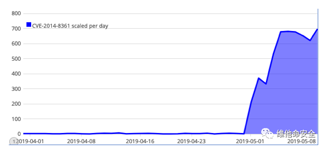 NetScout研究团队发现从2019年4月底到2019年5月上半月期间,利用Realtek SDK RCE漏洞(CVE-2014-8361)的攻击活动激增,攻击数量在此期间增长了5043%。这些攻击主要来自埃及,针对南非地区的路由器,分发的payload主要是Hakai DDoS bot的变体,该变体可用于发起基于HTTP、TCP、UDP的DDoS攻击。