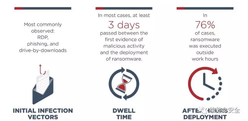 FireEye Mandiant的研究人员对2017年到2019年的勒索软件攻击数据进行了回顾,以识别出初始入侵媒介、攻击者在受感染网络上的平均驻留时间以及攻击者通常倾向于部署勒索软件的时间等共同特征。他们的研究表明,在大多数事件中,攻击者进入网络后至少等待三天即可识别关键系统并作为勒索软件攻击的目标。在大多数(75%)的案例中,从第一批恶意活动到部署勒索软件之间至少经过了三天,这意味着如果受害者组织能够足够迅速地发现初始活动,他们就有机会阻止攻击。研究还显示,在四分之三以上(76%)的事件中,攻击者部署勒索软件的时间是在正常办公时间之外(27%是在周末,49%是在工作日的上午8点之前或下午6点之后),这一趋势凸显了应急计划的必要性。