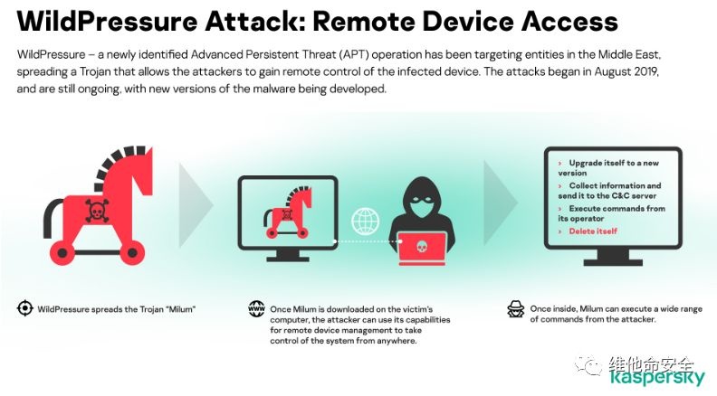 卡巴斯基实验室的安全专家发现针对中东工业组织的APT攻击活动WildPressure。研究人员在2019年8月首次发现了WildPressure,当时研究人员检测到一个新的恶意软件Milum。Milum是一个成熟的C++木马,该恶意软件与已知的任何攻击活动均没有相似的代码,也没有攻击目标上的交叉。实际上,研究人员仅在一个国家中发现了3个独立的样本。当前仍不清楚攻击者传播Milum木马的方式,并且无法将其归因,但研究人员认为攻击者可能会在其它攻击活动中重复使用该木马。