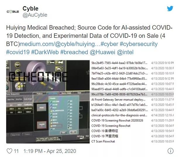 数据泄露通知公司Cyble研究人员发现,目前黑客正在出售汇医慧影COVID-19 AI辅助检测技术的源代码和实验数据。据悉,汇医慧影正在与华为合作,开发一种基于AI的COVID-19检测系统,该系统可以从胸部CT的DICOM图像检测是否存在感染症状。汇医慧影正以每月50000美元的价格出售该系统。而黑客声称其已获得COVID-19检测技术源代码以及验数据,并以4比特币的价格向外出售。被盗数据包括用户信息(1.5 MB)、技术和源代码(1GB)、Covid-19实验相关内容(150 MB)。