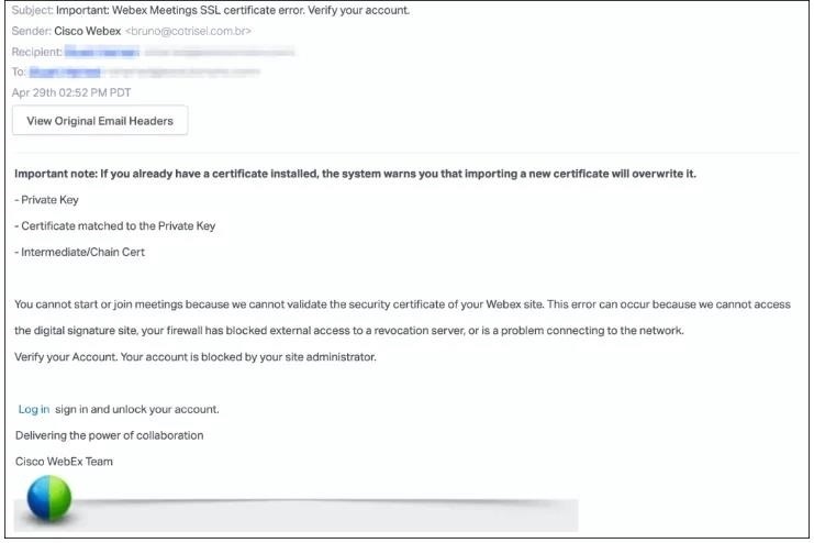 最近出现了新的网络钓鱼攻击活动,攻击者使用伪造的Cisco Webex证书错误警告,以窃取用户的帐户凭据。据邮件安全公司Abnormal Security统计的数据,此次事件已攻击超过5000个受害者。攻击者使用克隆的图形和格式来仿冒Cisco WebEx发送给用户的自动SSL证书错误警报,并警告受害者其因Webex Meetings SSL证书错误已被管理员阻止,必须验证帐户,从而诱使他们点击登录的链接以解锁帐户。之后该链接便会将用户重定向到网络钓鱼网站,并窃取其登陆凭证。
