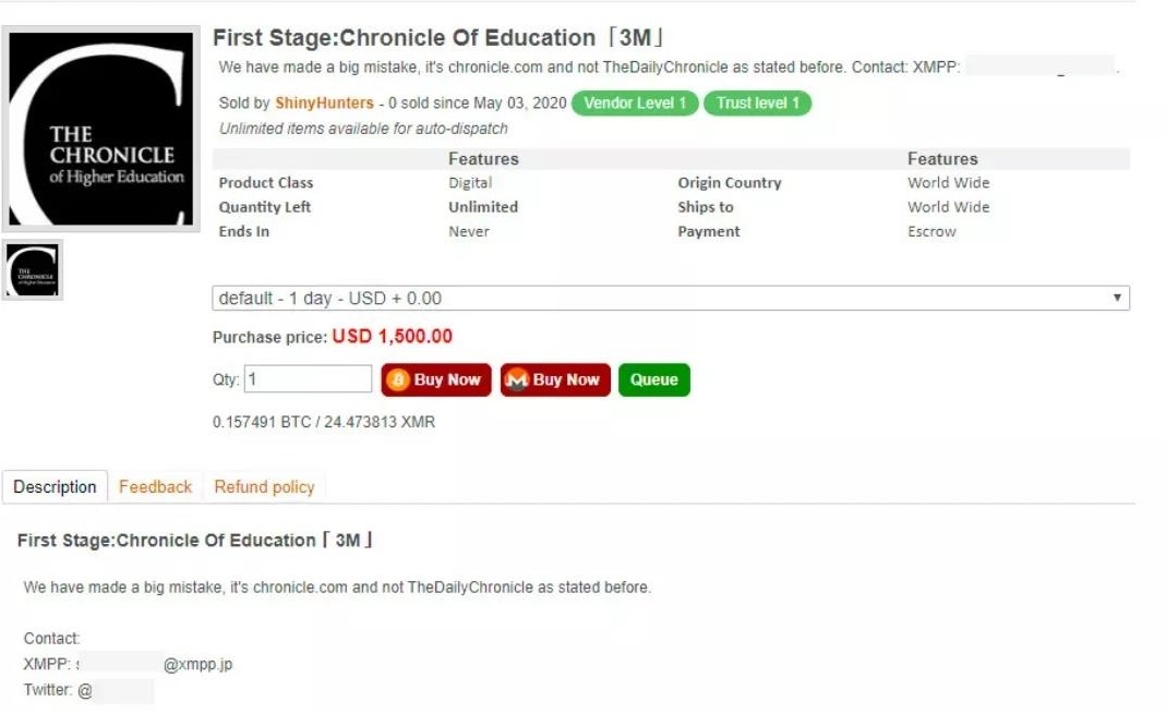 黑客组织Shiny Hunters窃取了餐包配送服务平台HomeChef、照片打印服务平台ChatBooks和高等教育新闻网站Chronicle.com三家公司中的2600万条用户信息,并在暗网上标价出售。HomeChef平台数据库包含800万条记录,包括bcrypt哈希密码、IP地址、电话号码、邮政编码和个人身份信息(PII),标价为2500美元。ChatBooks平台数据库包含1500万条数据,包括邮件地址、SHA-512密码、社交媒体访问令牌和一些PII,标价为2500美元。Chronicle.com网站数据库包含300万条用户记录,标价为1500美元。