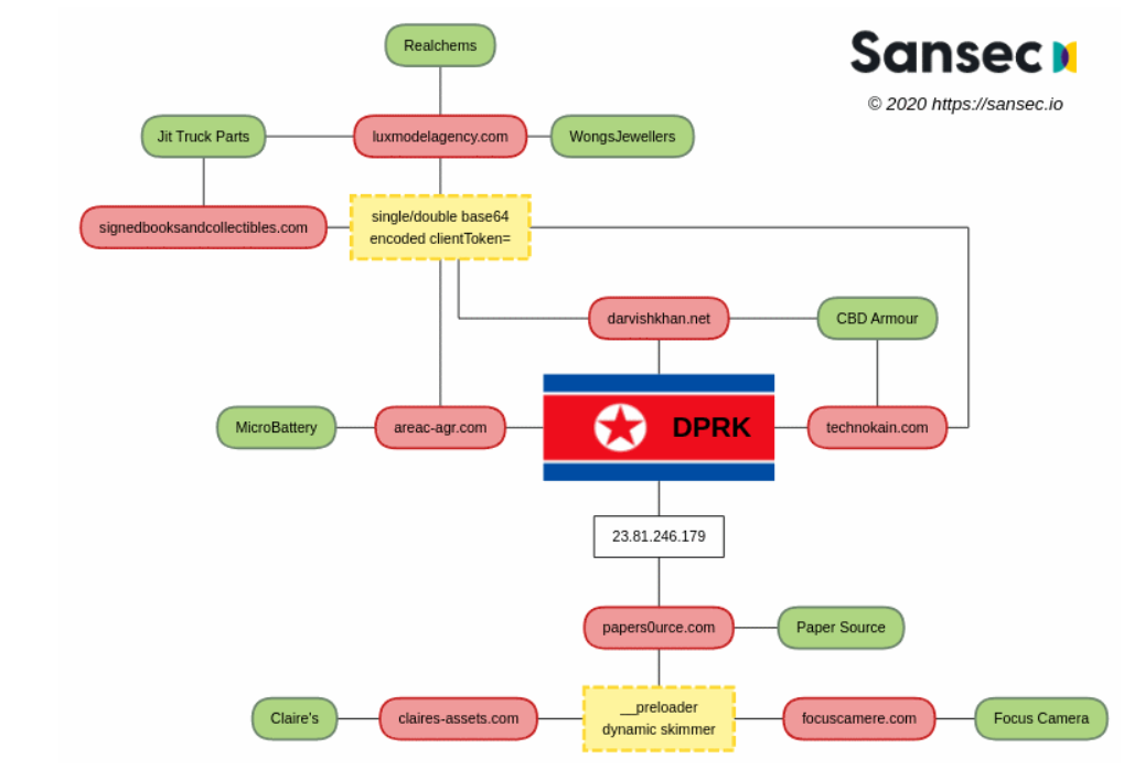 荷兰网络安全公司SanSec在今天发布报告中表示,自2019年5月以来,朝鲜一直在对网上商店进行Magecart攻击,受害者包括在今年4月和6月遭到破坏配件连锁店Claire's。SanSec发现最近的网络浏览攻击中使用的域和服务器IP地址与先前已知的朝鲜政府资助的黑客基础设施有关,并可以追溯到平壤黑客组织Hindden Cobra。平壤的黑客不仅参与了ATM网络抢劫,还策划了加密货币骗局,并攻击了加密货币交易所。