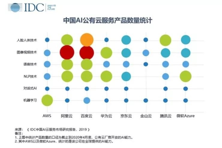 全球权威咨询机构IDC发布《中国人工智能云服务市场研究报告(2019)》。报告显示,在中国AI公有云服务整体市场格局中,百度智能云在整体调用量、市场份额方面均名列第一,拥有最多的AI产品数量。IDC认为,AI能力已成为用户选择云服务厂商时的重要考量因素。据统计,中国AI云服务市场2019年市场规模达1.66亿美元,2018至2024年复合年均增长率将达到93.6%。