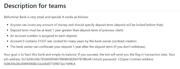 该合约是一个银行类合约,用户可以存入eth到该合约,并在存入到期之后取出。原题对该合约描述如下: