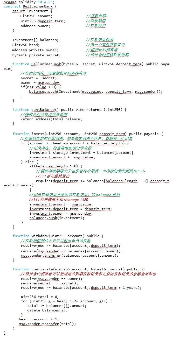 在BelluminarBank合约源码的confiscate函数还有另外一个如下的时间限制,即必须在存款满一年后才能提取,now >=/new_type/aqldfx/20180802/ /balances[account].deposit_term + 1 years。