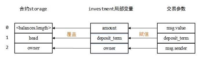 在invest函数的else分支中,使用了一个局部结构变量investment。该局部变量在当前执行分支中并没有被初始化,默认指向合约的storage。执行中对该变量的成员赋值就会直接覆盖全局变量,覆盖关系为: