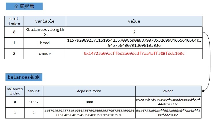 调用之后,新的存款记录数据将存放在balances数组索引为1的位置。此时的balances数组情况和全局storage变量情况如下图所示。