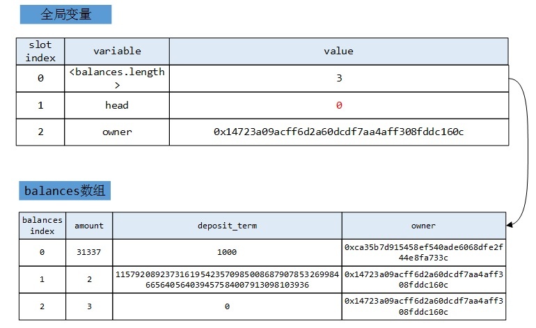 而提取余额是从balances数组中head索引开始的存款记录开始计算数额的。显然,为了提取到合约owner的余额,即balances[0]账户的余额,head必须被覆盖为0。因此,需要进行第二次storage变量覆盖,修改head。