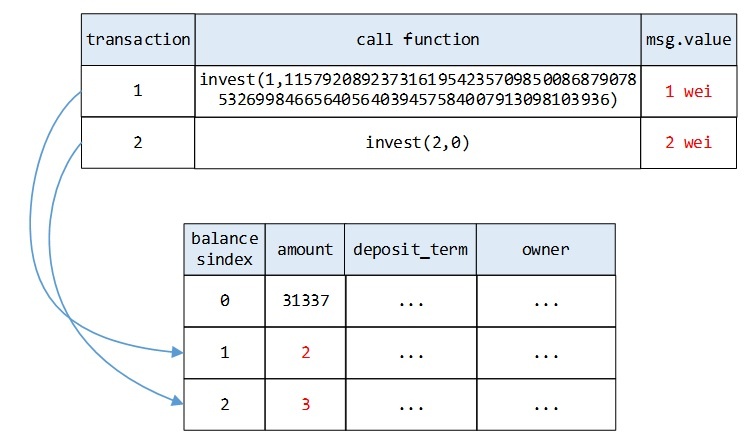 所以,每次调用invest函数进行变量覆盖,存款记录的账目金额都比调用者实际支付的msg.value大。下图是两次调用invest之后的balances数组情况。