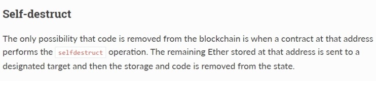 selfdestruct函数会将该合约的余额转到指定账户,然后从区块链中销毁该合约的代码和storage。该函数的官方文档说明[5]如下: