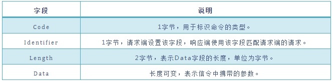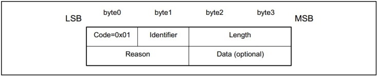 当Code=0x1,代表Command reject数据包,数据包定义如下所示。当Length不为0,data数据域中包含两个字段:Reason字段(2字节)和Data字段。