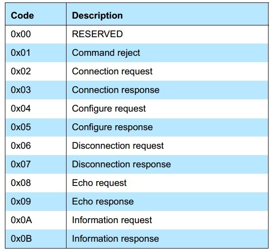 两台蓝牙设备通过L2CAP协议通信时,所有的信令都被发送到CID为0x0001的信道中。L2CAP信令的格式如下所示。