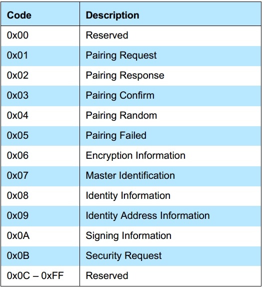 其中,Code字段为一个8bit,标识命令的类型。SMP命令的类型如下表所示。Data字段在长度上是可变的, Code字段决定Data字段的格式。
