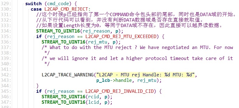 从代码291行开始,while循环解析L2CAP数据包中所有的COMMAND命令。首先看一下两个宏定义:STREAM_TO_UINT8从p指向的数据包中读取1个字节,p指针加1;STREAM_TO_UINT16每次从p指向的数据包中读取2个字节,p指针加2。