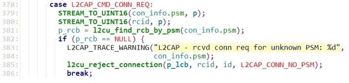 从378行代码开始是解析L2CAP_CMD_CONN_REQ命令分支,379行代码,先越界读取两个字节的con_info.psm,380行代码越界读取两个字节的rcid。381行调用l2cu_find_rcb_by_psm函数通过con_info.psm去遍历寻找注册控制块地址。这里简单介绍一下PSM这个概念。
