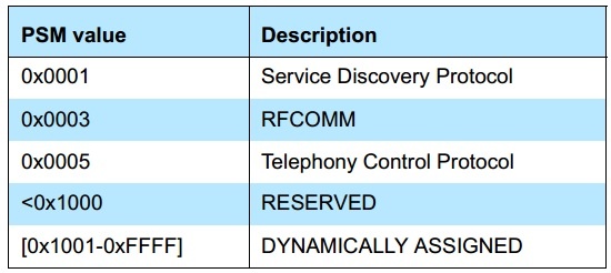 PSM全称为Protocol/ServiceMultiplexer,PSM的长度最少是2字节,它的值应当是奇数,就是最低的byte的最低位必须为1。另外,PSM的最高byte的最低位应当为0。它可以比2字节长,PSM由两个范围段组成,第一个范围段是SIG用来表示对应protocol的,第二个范围段是动态申请的和SDP结合使用。这个值用来支持特定protocol的不同实现。所以,在申请PSM的时候都是从0x1001开始申请的。原因就是0x0001~0x0eff都是被SIG保留的。那么这些保留的值都各自对应了哪些protocol呢?具体见下图。