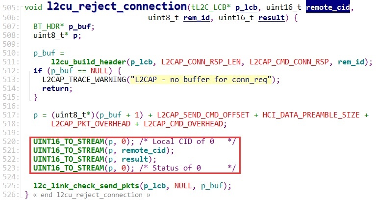 其中remote_cid就是之前越界读取的两个字节数据。构造好响应数据包后,代码525行调用l2c_link_check_send_pkts将响应包发送到客户端。